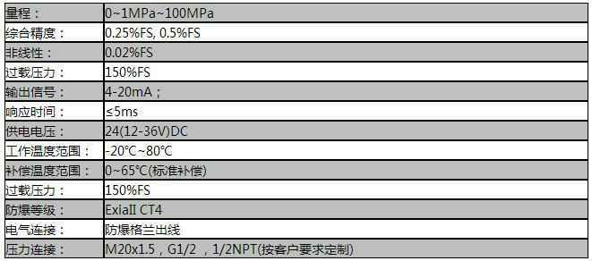 PT124B-283平膜型防爆压力变送器,测量端采用特殊处理坚固的齐平膜片,被测介质中坚硬微粒不会损坏隔离齐平膜片。结构紧凑、耐腐蚀,抗震动、抗微粒冲击、宽范围温度补偿。选用防爆外壳,带LCD显示。应用于液压、油田,矿井,化工,电力,锅炉,天然气等自动化领域的流体压力测量与控制。